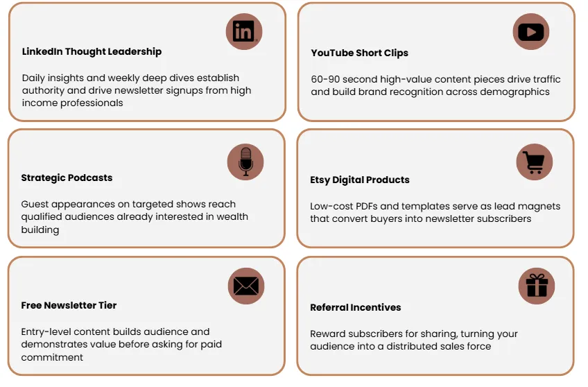 Sustainable newsletter growth requires multiple traffic sources working in concert. The strategy combines organic